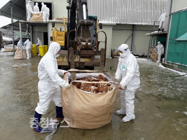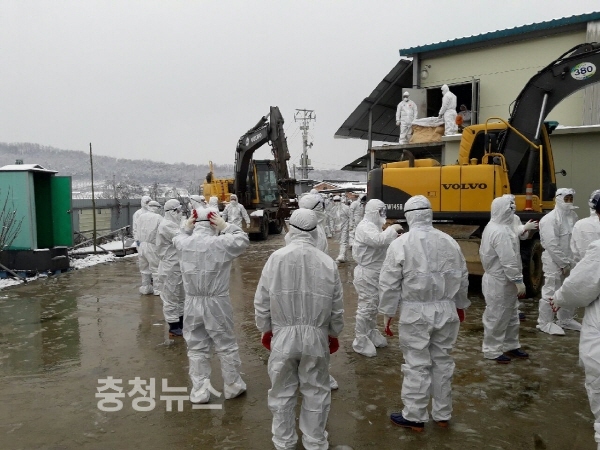 천안시청 직원 30여명은 토요일인 24일까지 서북구 입장면 가산리 소재 산란계 농장에서 29만500마리를 살처분하고 매몰작업을 하게 된다.
