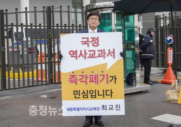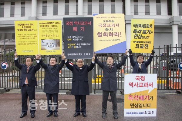 역사교과서 국정화 저지를 위한 전국 시도교육감협의회 비상대책위원회는 23일 세종시 교육부 앞에서 서울.부산.광주.세종.충남교육감 들은 기자회견을 열었다.