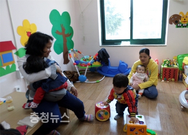 다문화 강사로 활동하고 있는 지역공동체일자리 사업 참여자들이 아이들을 돌보고 있다