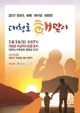 대전 대덕구(구청장 박수범)는 정유년 새해를 맞아 ‘새해! 새아침! 새희망’이라는 슬로건 아래 오는 새해 1일 오전 7시부터 대청호 비상여수로댐 둔치에서 ‘2017 정유년 대청호 해맞이’ 행사를 개최한다고  밝혔다.