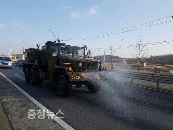 시는 AI가 확산됨에 따라 지난 26일부터 육군 32사단의 제독차량 1대를 지원 받아 방역에 나섰다.