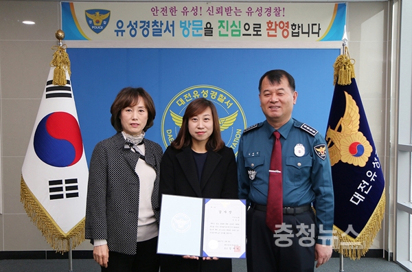 대전 유성경찰서 생활안전계 이명희 계장은 4일 오전 경찰서 3층 중앙홀에서 보이스피싱 예방에 기여한 유성구 전민농협 직원 이정선씨에 대한 감사장 수여식을 진행했다.