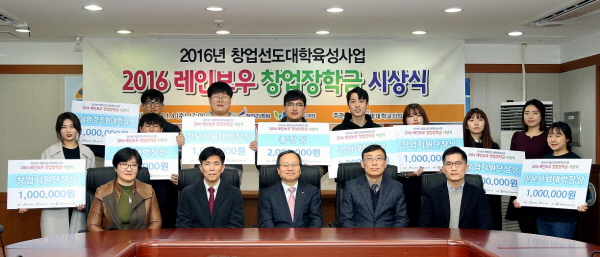 ‘2016 레인보우 창업장학금 수여식’은 4일 대학본부 2층 대회의실에서 열렸다. 수여식에는 최종 수혜대상으로 선정된 40명을 대표해 상위 9명의 학생들이 창업장학금을 수여받았다.