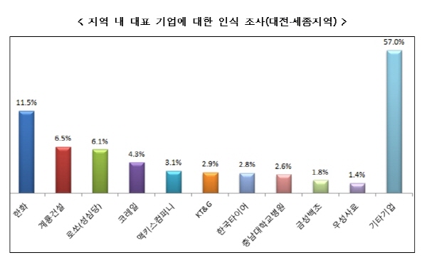 대전 및 세종지역 대학생들이 생각하는 지역 내 가장 대표적인 기업으로 ‘한화(11.5%)’가 선정됐다. 이어 ‘계룡건설(6.5%)’, ‘로쏘 성심당(6.1%)’ ,‘코레일(4.3%)’, ‘맥키스컴퍼니(3.1%)’, ‘KT&G(2.9%)’ 순으로 집계됐다.