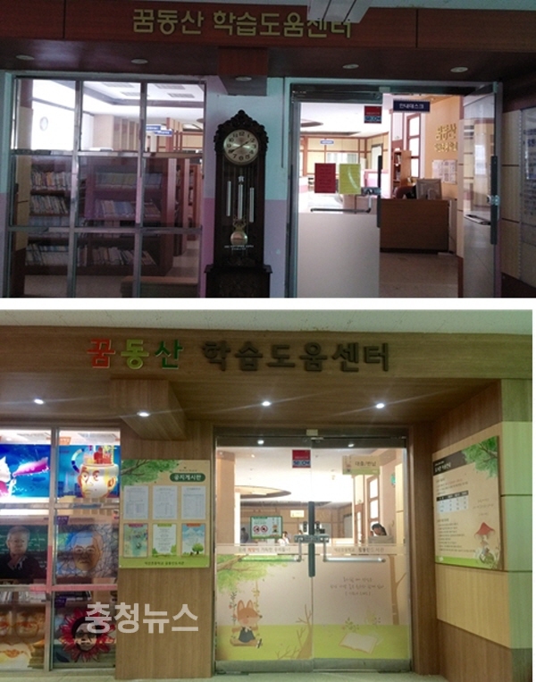 학교도서관 환경개선 및 조도개선 지원 도서관 입구 (위쪽 :개선 전, 아래: 개선 후)