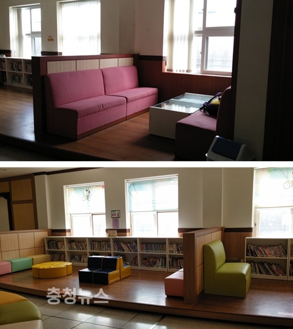 학교도서관 환경개선 및 조도개선 지원 쇼파벽면 (위쪽: 개선 전. 아래: 개선 후)