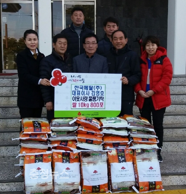 한국메탈(주) 김영호 대표이사는 당진 합덕농협에서 해나루쌀 8000kg(800포)를 구매하여 10일 쌀이 생산되지 않는 제주도 서귀포시 성산읍에 기탁했다.