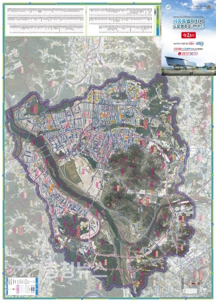 뒷면에는 세종시 전역의 도로명, 법정동과 법정리, 도로의 시작점과 끝지점을 표기했고, 우편․통계․경찰․소방․학교 등 각종 구역을 일원화한 국가기초구역번호를 한 눈에 담았다.
