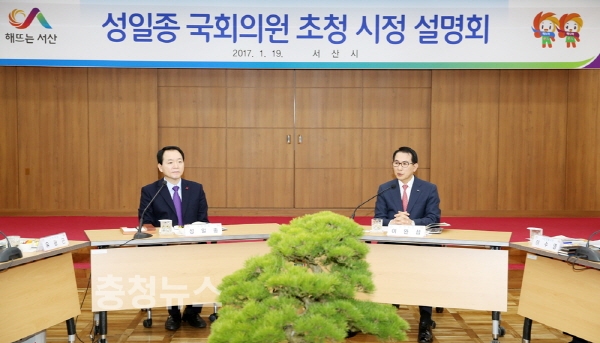 충남 서산시는 19일 시청 중회의실에서 이완섭 서산시장을 비롯해 간부공무원 등 30여명이 참석한 가운데 성일종 국회의원을 초청, 시정설명회를 개최했다.
