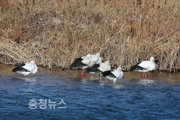 20일 충남 서산시에 따르면 최근 부석면 천수만에 위치한 간월호 부근에서 십여마리의 황새가 먹이를 찾고 있는 모습이 시 버드랜드사업소 직원인 문은기(51세)씨의 카메라에 잡혔다.