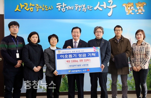 대전 서구 장종태구청장은 23일 구청 다목적실에서 한국과학기술원 노동조합 김세동지부장으로부터 백미 2,000kg(340만 원 상당), 라면 230박스(287만 원 상당)를 사회복지공동모금회를 통해 기탁받았다고 밝혔다.