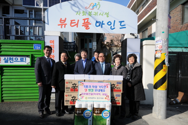 대전 동구의회(의장 박선용)가 설 명절을 맞이하여 지난 24일 홍도동 주간보호센터, 가양동 뷰티풀마인드, 자양동 사랑의집 등 관내 사회복지시설 3곳을 찾아가 위문했다.