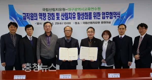 산림청 한국산림복지진흥원(원장 윤영균)은 25일 국립산림치유원(원장 연평식)과 대구광역시교육연수원(원장 한원경)이 경북 영주시 봉현면 국립산림치유원 건강증진지원센터에서 산림치유 활성화 및 교직원 역량 강화를 위한 업무협약(MOU)을 체결했다고 밝혔다.