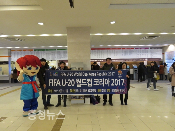 충남 천안시 U-20월드컵지원단은 ‘FIFIA U-20 월드컵 코리아 2017’ 마스코트 차오르미와 함께 설명절을 맞아 26일 종합터미널, 천안역, 중앙시장에서 대회 홍보에 나섰다.