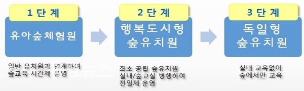 행복도시 숲유치원은 독일형(숲에서만 체험․교육이 이루어지는 공립유치원) 숲유치원을 지향하며, 모델을 3단계*로 나눠 단계적으로 추진할 계획이다.