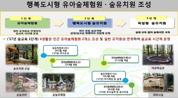 또한, 행복도시 내 국내 최초 공립 숲유치원 건립을 추진하고, 교육청과 함께 행복도시형 숲유치원에 적합한 교육프로그램을 연구․개발할 예정이다.