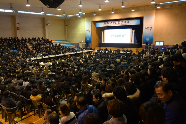 논산시(시장 황명선)가 4일 국민체육센터서 ‘2017년 직원만남의 날’ 행사를 갖고 주요업무보고, 정부예산확보방안, 직원과의 대화시간을 통해 지속 가능한 발전을 위한 성장 동력 제시와 시민이 행복한 사람 중심 논산시대 구현에 시정 역량을 집중해 나갈 것을 다짐했다.