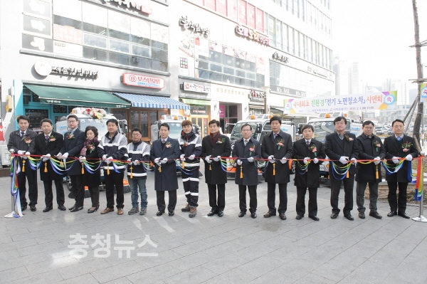 이춘희 세종특별자치시장이 7일 오전 도담동 도램마을 상가 밀집지역에서 이택산업(주)과 공무원 등 50여명이 참석한 가운데 전기노면청소차 시연회를 가졌다.