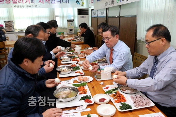 충남 서천군은 7일 점심시간을 활용해 군청 구내식당에서 노박래 서천군수를 비롯한 공무원 300명이 참석한 가운데 닭고기 소비촉진을 위한 ‘닭고기 및 계란 시식회’를 가졌다.