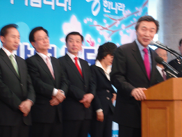 ▲ 박근혜.이명박.손학규 기자 회견장 국민 모두는 한나라가 한 마음이 돼 정권교체가 유일한 희망이라고 한다. 12.19일 돼 정권이 바뀌었으면 좋겠다는 생각으로 속이 상해도 참고 있는 것이다. 그래서 한나라 할 일이 많다. 우리가 단결할 때 지금보다 더 큰 지지를 줄 것으로 생각한다. 전국에 있는 우리당원 깊은 관심을 갖고 앞도적인 승리 해야만 한다. 저도 승리에 참여하겠다. ▲ 이명박 지지자들