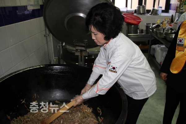 송경자 총재가 직접 취사실에서 급식을 만들고 있다.