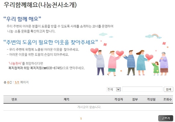 ‘우리 함께 해요’ 는 복지사각지대에 놓여 절실한 도움이 필요한 이웃의 사연을 소개하고 후원자를 발굴 및 연계해 어려운 이웃들이 희망을 가질 수 있는 발판을 마련하고 미담 사례를 전파함으로서 많은 구민들이 직접 나눔 실천에 참여할 수 있는 코너이다.