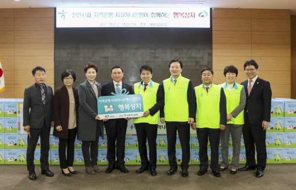KEB하나은행(은행장 함영주)은 17일 잡곡 등 식료품 10종을 담아 정성스럽게 만든 ‘행복상자’ 400박스(2,000만원 상당)를 천안시에 전달했다.