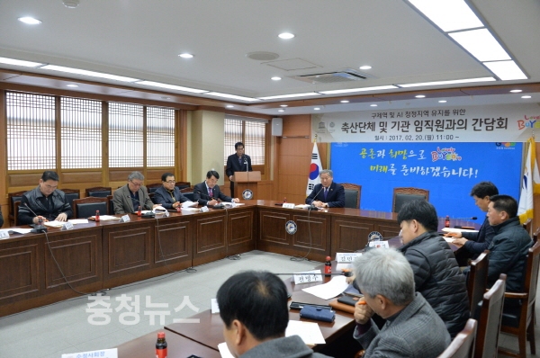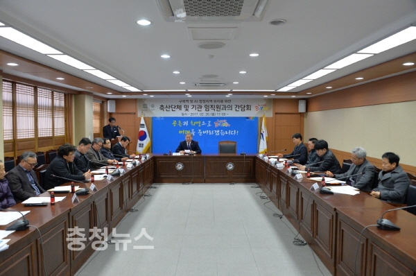 충남 부여군 이용우 군수는 지난 20일 부여군청 브리핑실에서 최근 성행하는 악성 가축전염병 구제역과 AI 예방을 위한 축산단체 및 관련기관 임직원 간담회를 가졌다.
