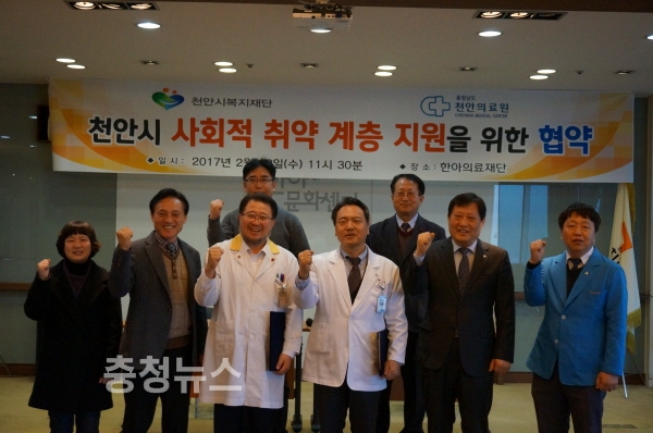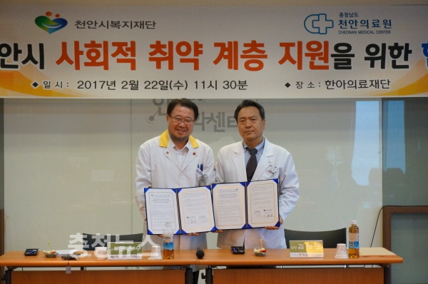 충남 천안시복지재단(문은수 이사장)은 충청남도천안의료원(원장 김영호)과 22일 한아의료재단에서 천안시 사회적 취약계층 지원을 위한 업무협약을 체결했다.