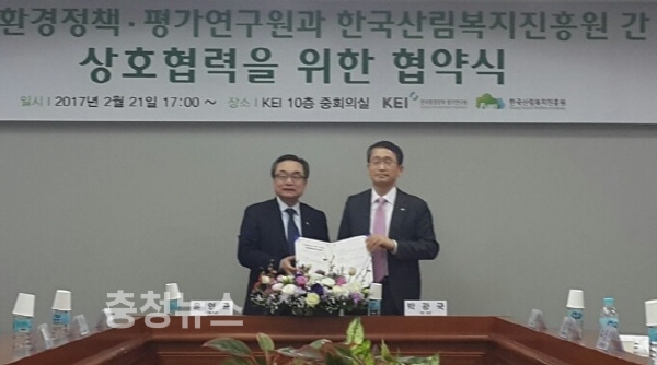 한국산림복지진흥원(원장 윤영균)은 세종시 시청대로 세종국책연구단지 내 한국환경정책·평가연구원 중회의실에서 산림복지서비스 등 산림·환경 분야의 신규역할 창출을 위한 업무협약(MOU)을 체결했다고 22일 밝혔다.