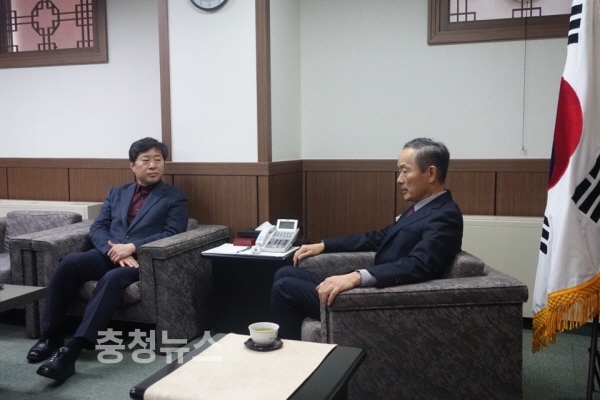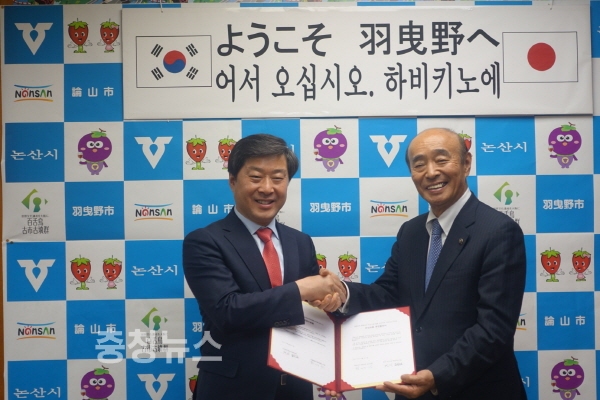 황명선 논산시장이 지난 21일 일본 하비키노시(Habikino, 羽曳野市)를 공식 방문, 기타가와 츠구오 하비키노시장을 예방하고 중학생 글로벌 인재 연수의 성공적 추진을 위한 협력방안을 논의했다.