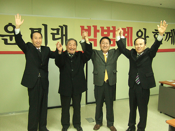 | ▲ 좌측부터 홍유택 선대본부장,윤기한 충남대 명예교수,박 후보 이선중 후원회장. | ||