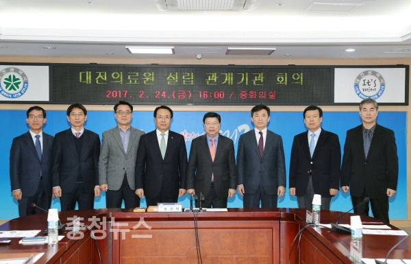 대전시가 24일 오후 시청 중회의실에서 권선택 시장, 한현택 동구청장, 이중화 의료원설립추진위원회 부위원장, 박남일 도시공사 사장과 관련 실국장이 참석한 가운데 대전의료원 설립 관계기관 회의를 개최했다.
