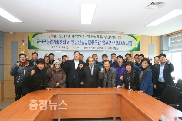충남 금산 농업기술센터(소장 이갑수)와 만인산농업협동조합(조합장 전순구)이 24일 농업기술센터에서 신소득 작목인 금산 새싹인삼과 약초 쌈채류의 생산, 유통지원을 위한 업무협약을 체결했다.
