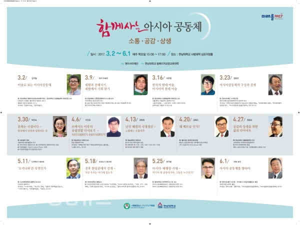 또한 ‘함께 사는 가치’를 모색하기 위해 난민 지원 사업에 매진해 온 에코팜므의 박진숙 대표를 비롯해, 네팔, 베트남 및 중앙아시아를 중심으로 활동하는 연구자와 활동가 등을 강연자로 초청하여 다양하고 실질적인 <소통·공감·공생>의 방안을 모색한다. 이밖에도 한남대 교수들이 예술, 역사 등에 대해 강연한다.