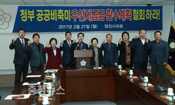 당진시의회(의장 이종윤)가 27일 정부의 공공비축미 우선지급금 환수조치를 철회할 것을 강력히 촉구하고 나섰다.