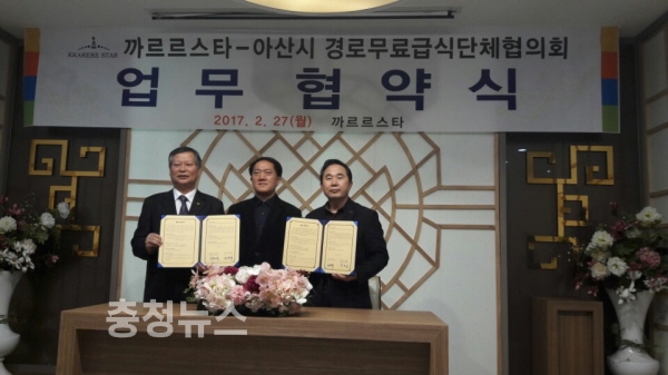 충남 아산시 경로무료급식단체협의회(회장 박태순)는 27일 까르르스타(대표 김경회)와 무료경로식당 자원봉사자 주차장 지원을 위한 업무협약을 체결했다.
