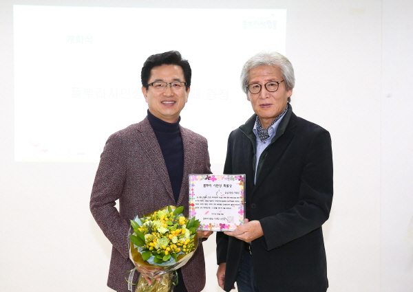 허태정 유성구청장이 지난 28일 제9회 (사)풀뿌리사람들[오른쪽 송인준 이사장]정기총회에서 로컬푸드 활성화를 통한 사회적경제생태계 조성 유공으로 풀뿌리 시민상을 수상받고 있다.