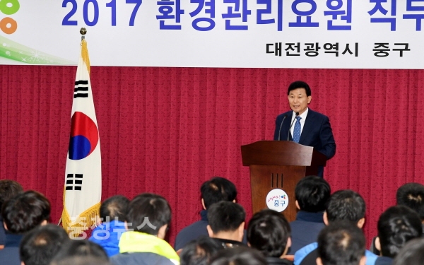 대전 중구 박용갑 청장은 2일 구청 대회의실에서 환경관리요원 및 대형폐기물 수거원 등 119명이 참여한 가운데 ‘환경관리요원 직무·안전교육’을 실시했다.