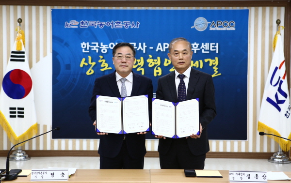 한국농어촌공사(사장 정승)와 APEC기후센터(원장 정홍상)는 3일 경기 수원시 농어촌공사 토지개발사업단에서 농업·농촌 분야 기후변화 대응방안을 공동으로 추진하기 위해 업무협약을 체결했다.