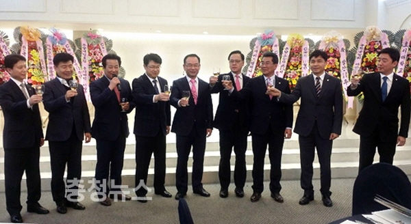 복기왕 아산시장, 오안영 아산시의회 의장, 이명수 국회의원, 강훈식 국회의원, 김준표 아산교육장 등 내빈 건배