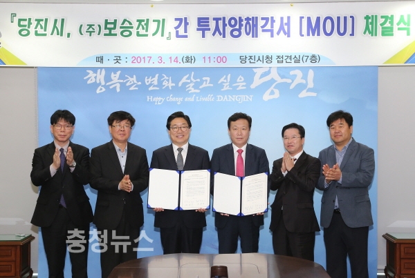 이날 협약에 따라 ㈜보승전기는 3년 동안 약 90억여 원을 투자해 당진시 시곡동 소재 당진농공단지 내 옛 두영전자 부지에 총 면적 2만3,238㎡ 규모의 공장을 설립한다.