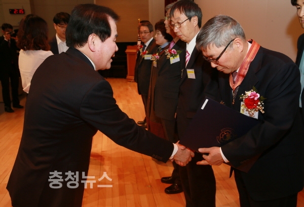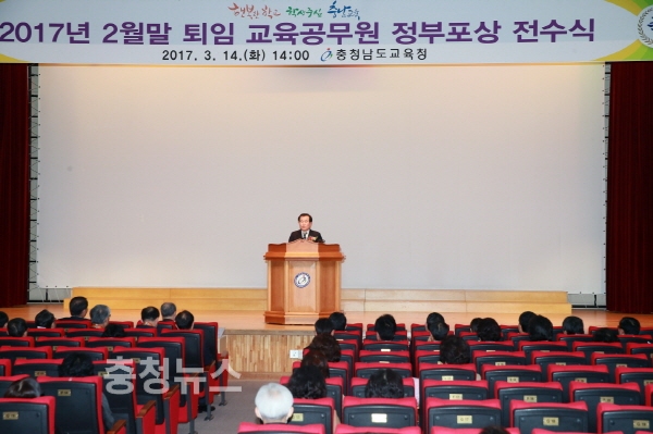 충남도교육청(교육감 김지철)은 14일 본청 대강당에서 퇴임교육공무원 및 가족들이 참석한 가운데 올해 2월말 퇴임 교육공무원에 대한 정부포상 전수식을 가졌다.