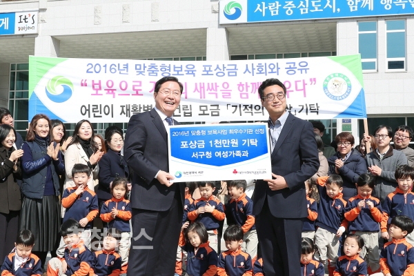 이번 기탁금은 보건복지부주관 ‘2016년 맞춤형 보육 평가’에서 전국 지방자치단체 중 최우수 기관으로 선정되어 받은 포상금(1천만 원) 전액이다.