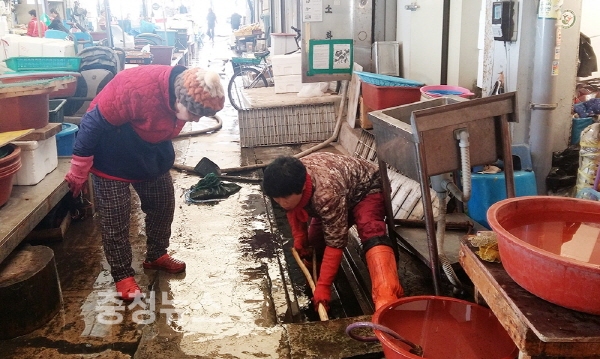 이날 상인 150여명은 자기 점포 앞 배수로를 들어 올리고 안에 쌓인 모래나 기름찌꺼기를 삽으로 퍼내는 등 겨우내 묵은 찌꺼기를 걷어냈다.