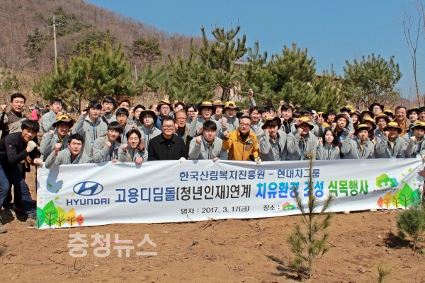 윤영균 한국산림복지진흥원장이 17일 경북 예천군 효자면 국립산림치유원 문필지구 일대(0.5ha)에서 현대차그룹 고용디딤돌(청년인턴)사업 연계 기업 참여형 식목행사를 개최했다.