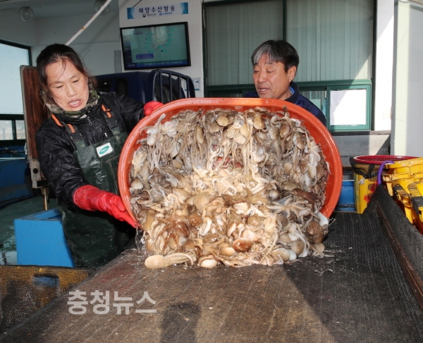 16일 충남 태안군 남면 몽산포항에서 어민들과 위판장 직원들이 수확된 주꾸미를 선별하고 있다.