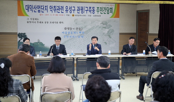 주민간담회는 이동욱 지역주민의 “관평동 및 구즉동 일원의 악취로 인한 주민불편, 피해사례 및 건의사항”에 대한 발표에 이어 이윤구 대전광역시 기후대기과장의 악취관리현황과 추진상황 설명 후, 조원휘 의원이 좌장을 맡아 송치현 대전시 자원순환과장, 한규호 유성구 환경지도담당 등이 참석한 가운데 지역주민들과 악취관리기관(대전시 및 유성구)관계자들의 질의응답으로 간담회가 진행됐다.