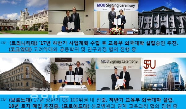 행복청은 그 동안 업무협약을 체결한 아일랜드 트리니티대는 올 해 하반기 사업계획 수립 후 교육부 외국대학 설립 승인을 추진할 예정이며, 아일랜드 코크약대는 현재 고려약대와 공동 학위 및 연구 과정을 협의하고 있다.