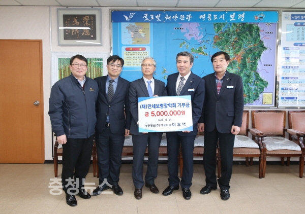 충남 보령시는 지난 21일 오후 시장실에서 김동일 시장과 서울전선(주) 이장열, 두원전선(주) 이후덕 대표가 참석한 가운데 지역 인재 양성을 위한 장학금 500만 원을 (재)만세보령장학회로 기탁했다고 밝혔다.
